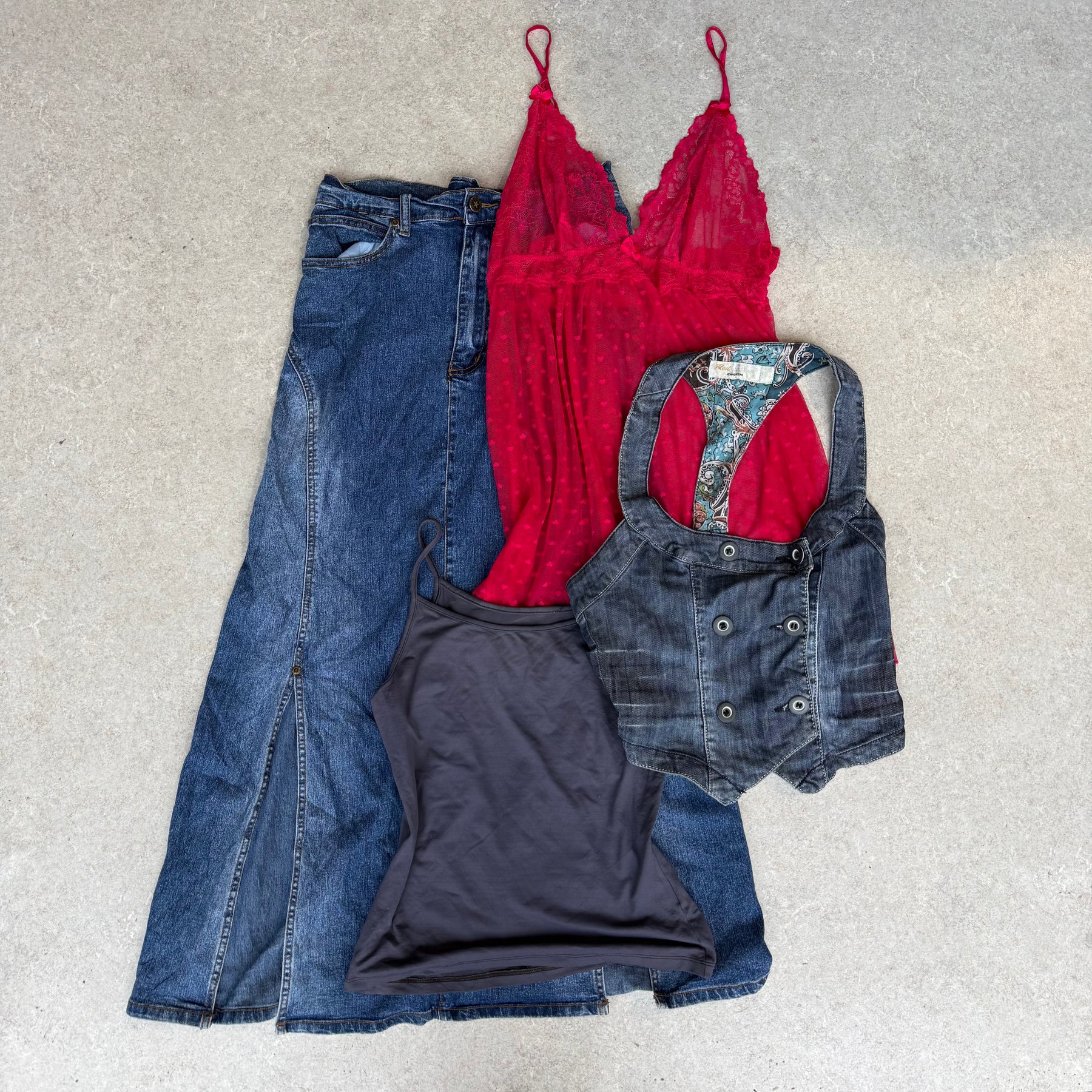 Cami top, Top, Long Denim Skirt, Mid Denim Skirt, Mini Denim Skirt, Skirt, Denim Jacket, Denim Waistcoat, Dress, Leather Jacket, Velvet Trousers, Mini Shorts, Jeans